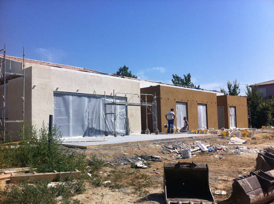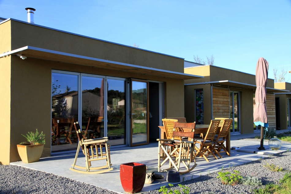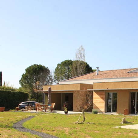 Cette maison « passive » à très basse consommation d’énergie, d’une surface habitable de 143 m2 et située à Montferrier-sur-Lez, a été réalisée avec des matériaux sains et naturels (sans dégagements toxiques pour la santé). Murs en ossature bois et isolation en paille de 50 cm d’épaisseur avec un enduit intérieur en terre de 6 cm pour l’inertie (capacité à retenir la chaleur et à la restituer), le confort thermique, hygrométrique (air ni sec ni humide) et acoustique. L'enduit en terre est également un excellent antistatique (fixe la poussière). Température intérieure constante de 23°C sans apport de chauffage, à l’exception d’un poêle à bois choisi en chauffage d’appoint. Ventilation double flux qui renouvelle l’air tout en récupérant la chaleur produite dans les salles d’eau et cuisine. Eau chaude sanitaire par capteurs solaires, ballon avec appoint électrique. Enduit extérieur à base de chaux.