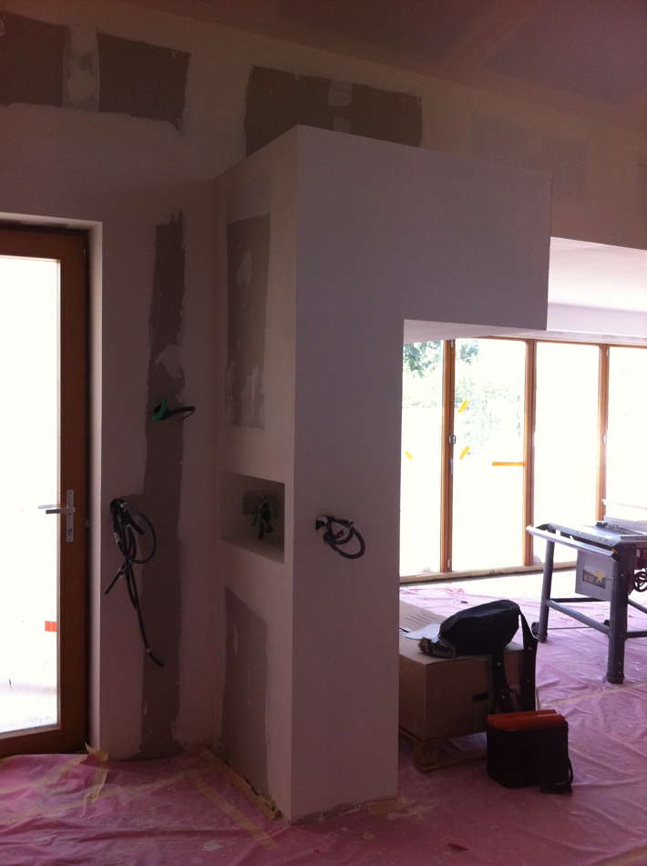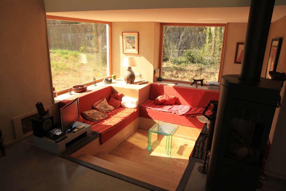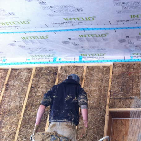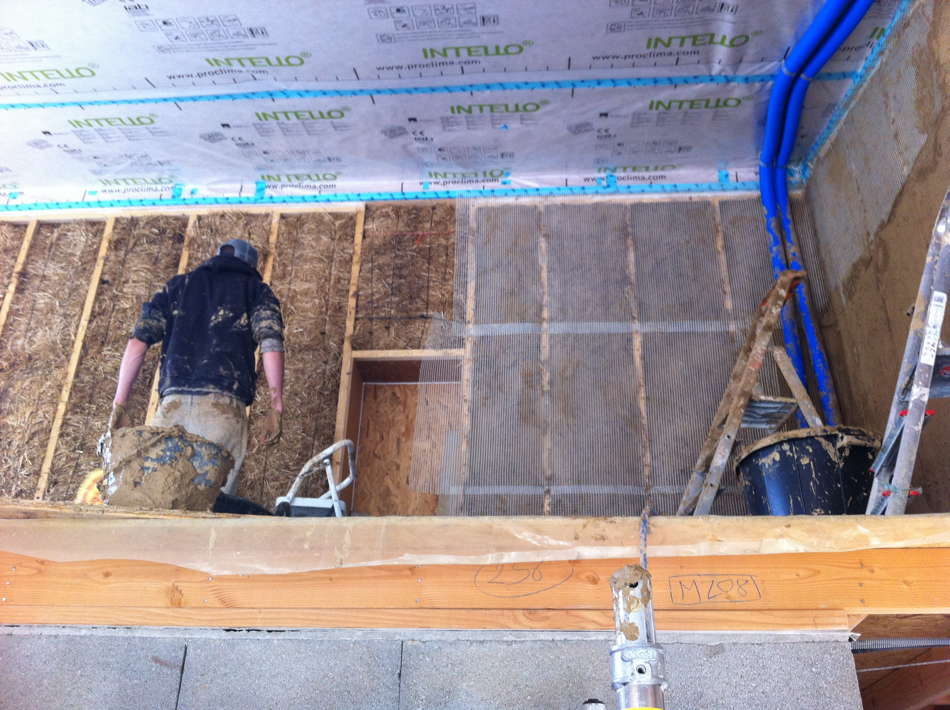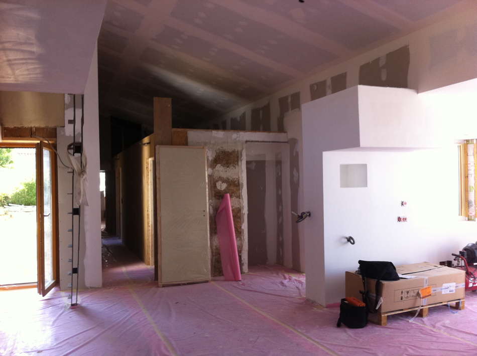 Maison « passive » en ossature bois et isolation en paille, enduit terre intérieur