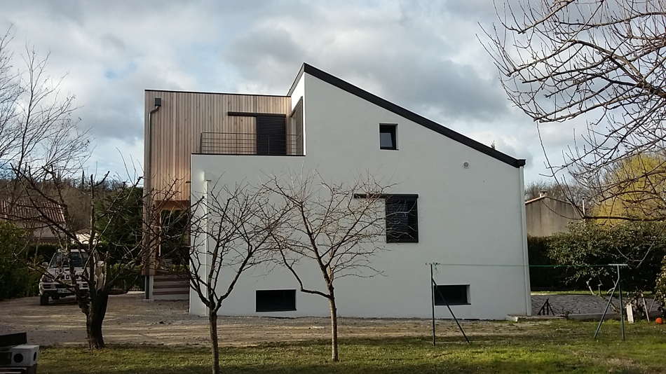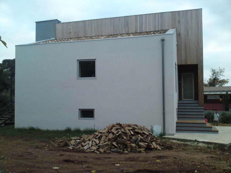 Structure et charpente en bois, isolation en ouate de cellulose avec complément d’isolation par l’extérieur en fibre de bois. La finition extérieure est un enduit taloché fin.