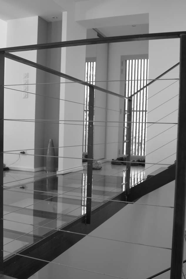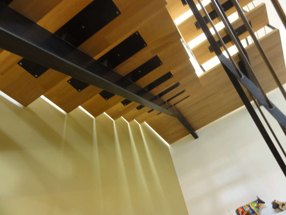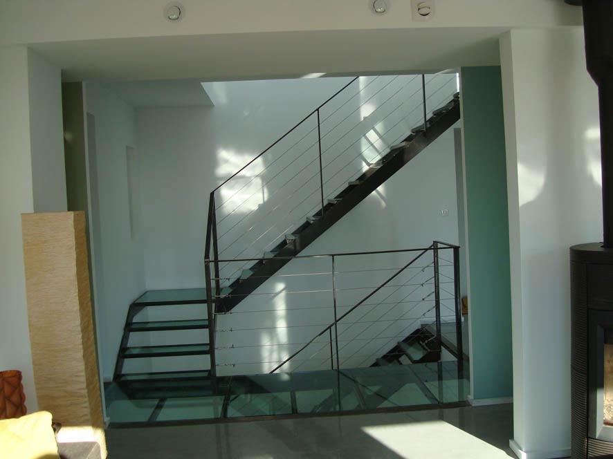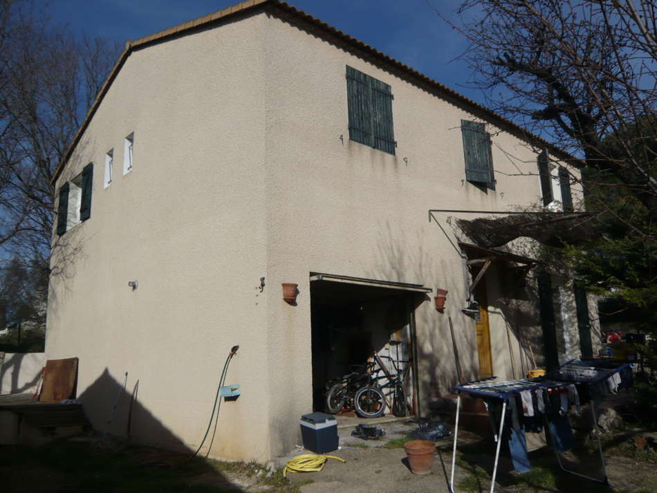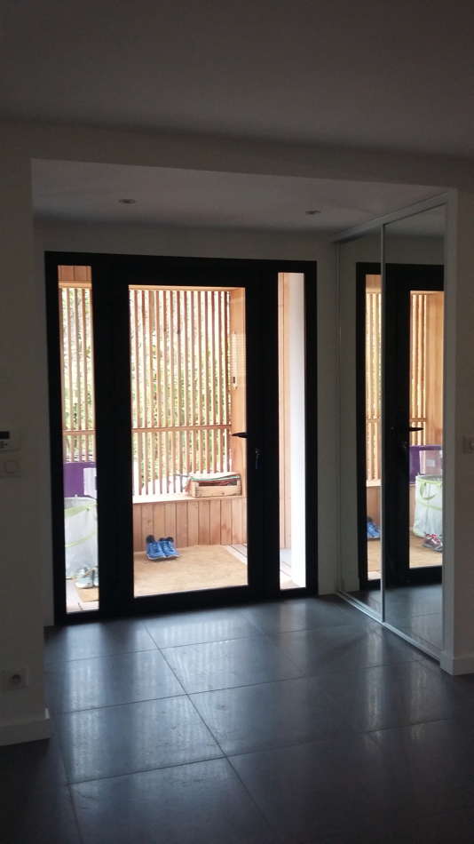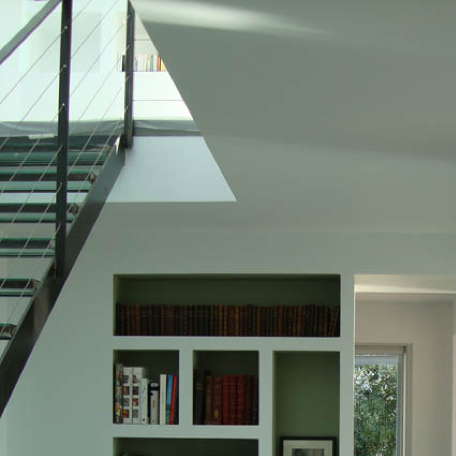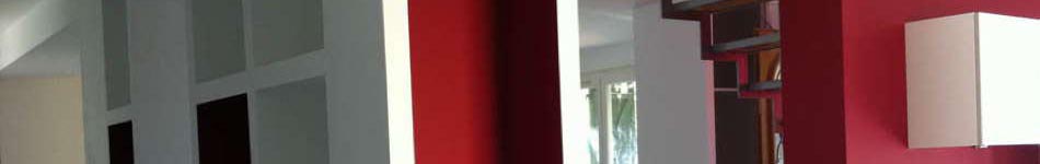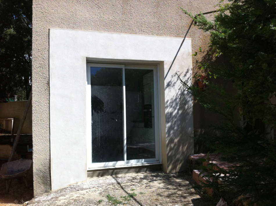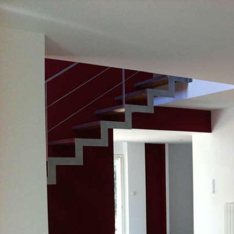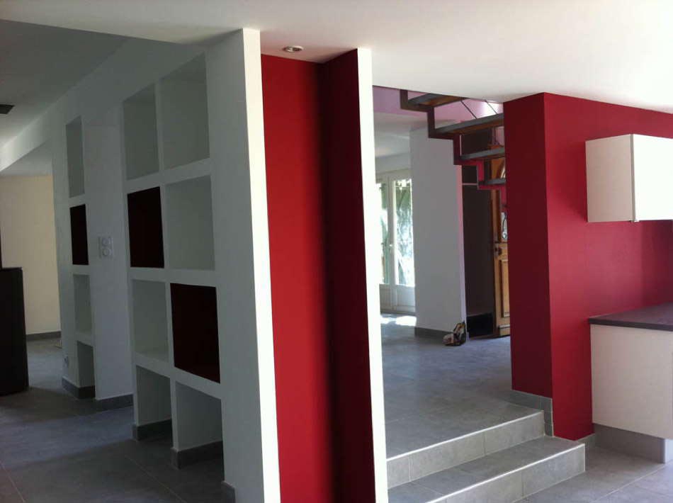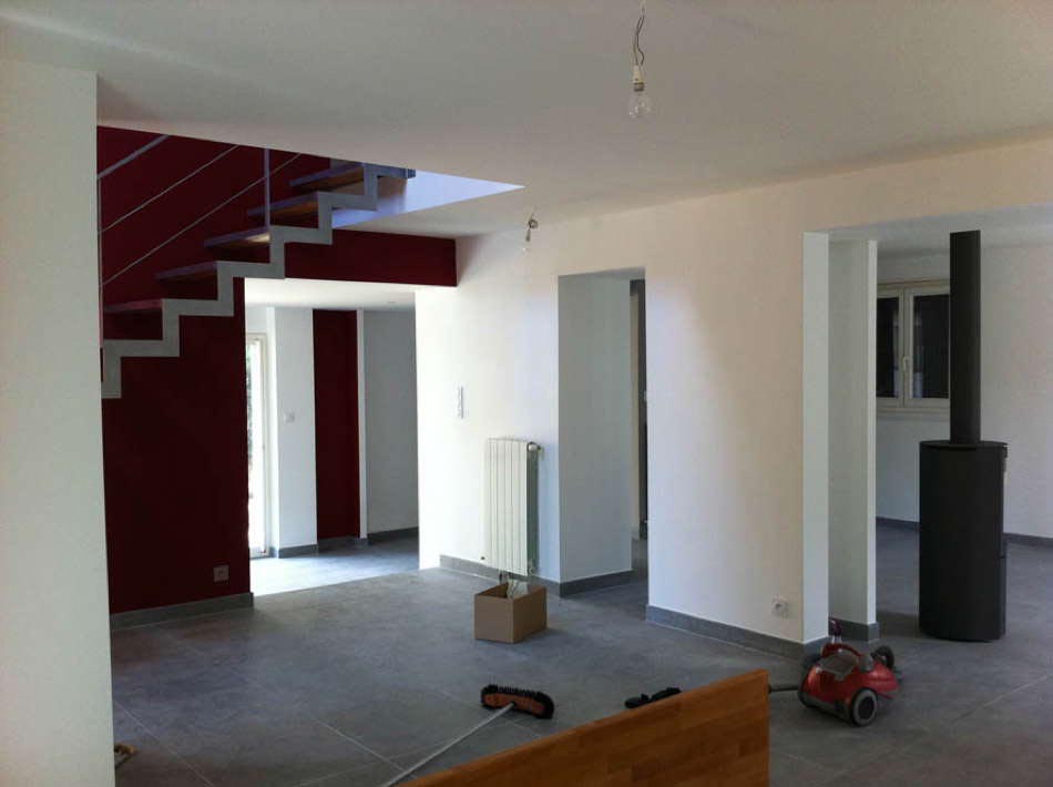 Surface rénovée 95 m2. Transformation du garage en cuisine (autre garage construit sur le terrain), restructuration du RDC, création d'une salle d'eau et d'un bureau à l'étage, agrandissement trémie de l'escalier.