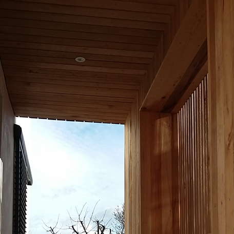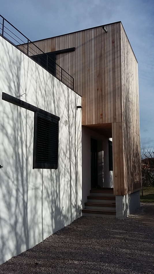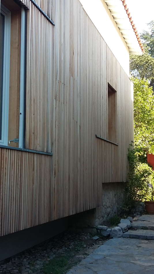 Cette extension en ossature bois, en surélévation du niveau principal, formant porche d’entrée, et laissant place à 2 terrasses de part et d'autres de l'extension bois, a permis notamment de rendre habitable des combles qui ne l'étaient pas (surélévation de la toiture initiale à 2 pentes). Réhabilitation en réglementation thermique 2012 (isolation par l’intérieur). Plancher chauffant réversible + poêle souhaité par le maître d'ouvrage, VMC simple flux.