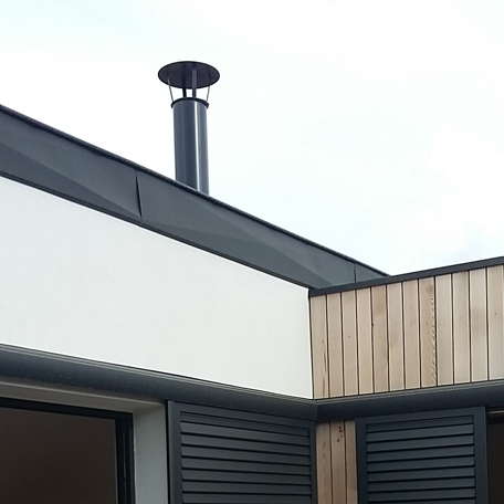 Isolation par l’extérieure, ventilation double flux, eau chaude sanitaire par capteurs solaires + ballon appoint électrique, poêle à bûches.