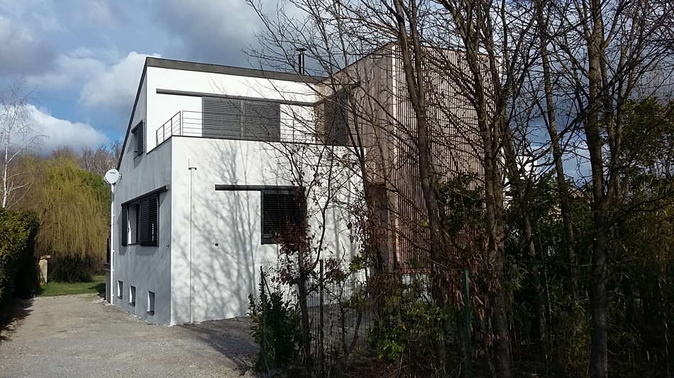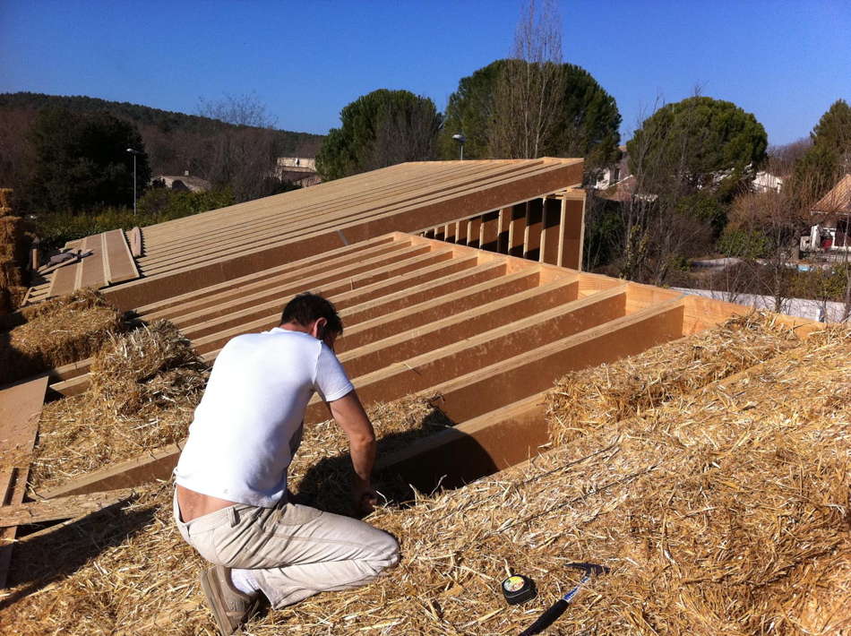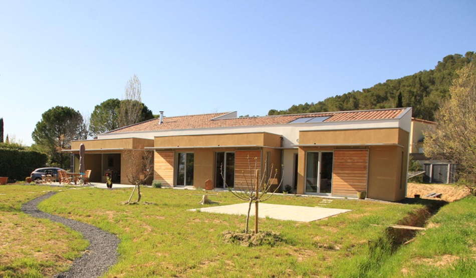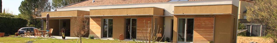 Cette maison « passive » à très basse consommation d’énergie, d’une surface habitable de 143 m2 et située à Montferrier-sur-Lez, a été réalisée avec des matériaux sains et naturels (sans dégagements toxiques pour la santé). Murs en ossature bois et isolation en paille de 50 cm d’épaisseur avec un enduit intérieur en terre de 6 cm pour l’inertie (capacité à retenir la chaleur et à la restituer), le confort thermique, hygrométrique (air ni sec ni humide) et acoustique. L'enduit en terre est également un excellent antistatique (fixe la poussière). Température intérieure constante de 23°C sans apport de chauffage, à l’exception d’un poêle à bois choisi en chauffage d’appoint. Ventilation double flux qui renouvelle l’air tout en récupérant la chaleur produite dans les salles d’eau et cuisine. Eau chaude sanitaire par capteurs solaires, ballon avec appoint électrique. Enduit extérieur à base de chaux.