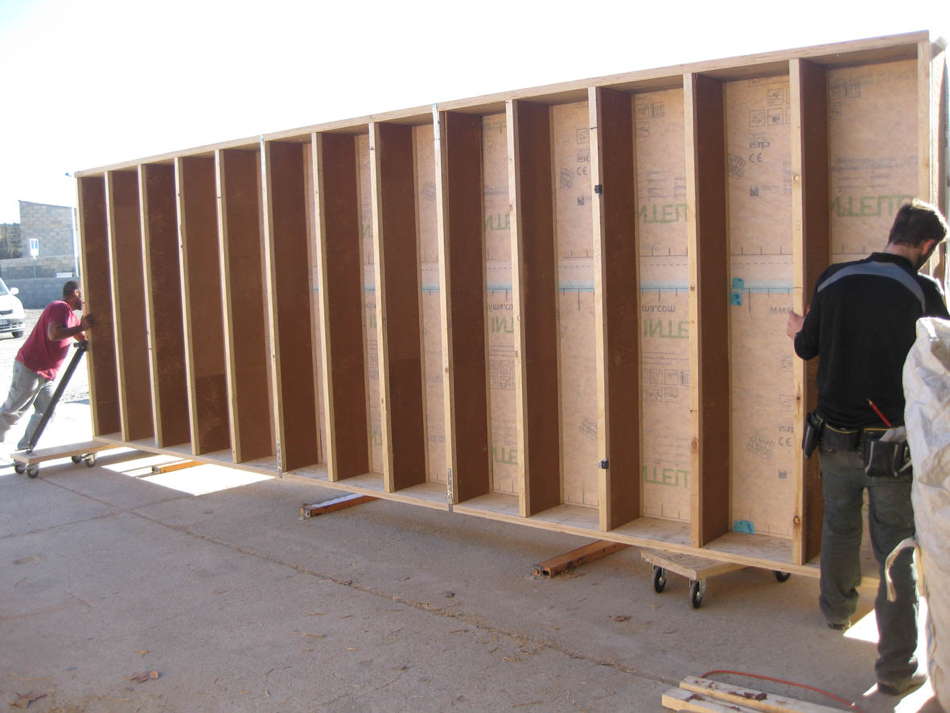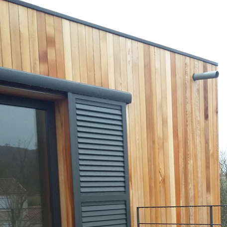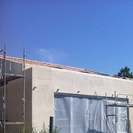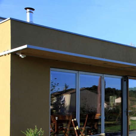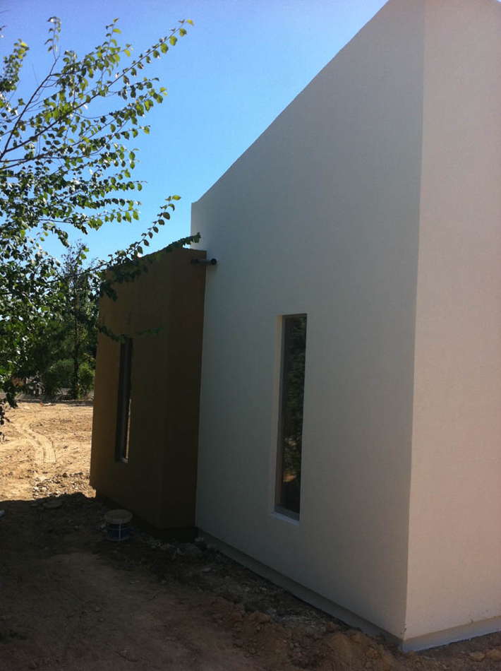 Structure et charpente en bois, isolation en ouate de cellulose avec complément d’isolation par l’extérieur en fibre de bois. La finition extérieure est un enduit taloché fin.