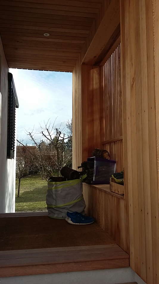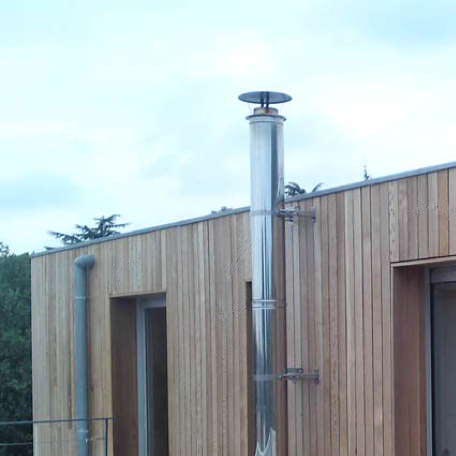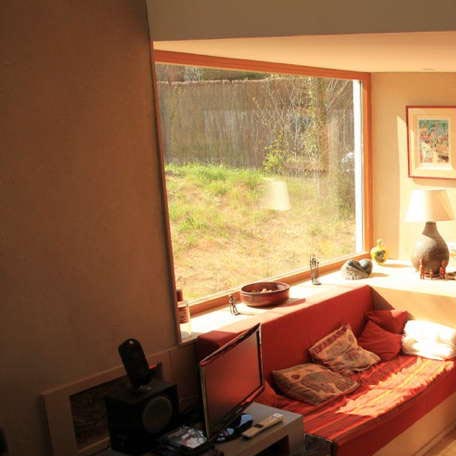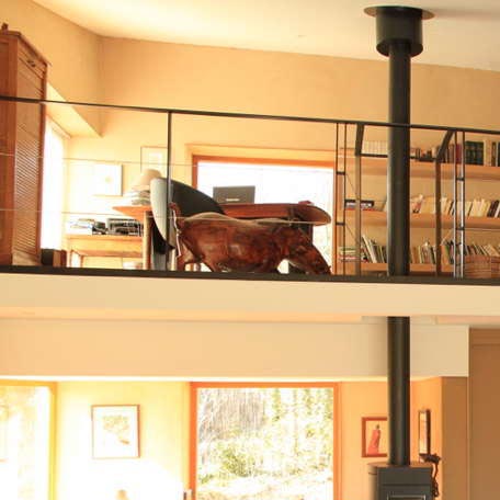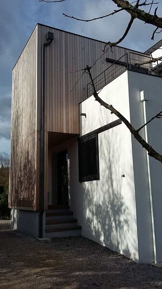 Cette extension en ossature bois, en surélévation du niveau principal, formant porche d’entrée, et laissant place à 2 terrasses de part et d'autres de l'extension bois, a permis notamment de rendre habitable des combles qui ne l'étaient pas (surélévation de la toiture initiale à 2 pentes). Réhabilitation en réglementation thermique 2012 (isolation par l’intérieur). Plancher chauffant réversible + poêle souhaité par le maître d'ouvrage, VMC simple flux.