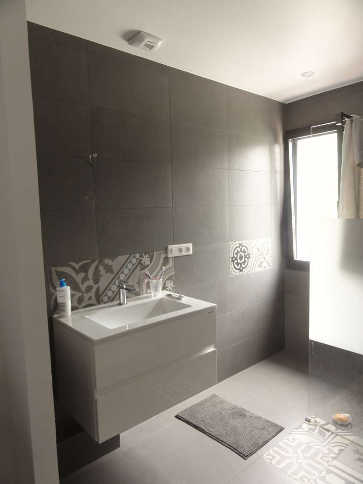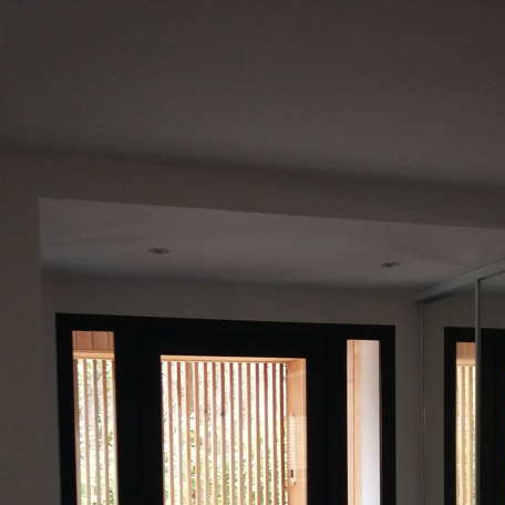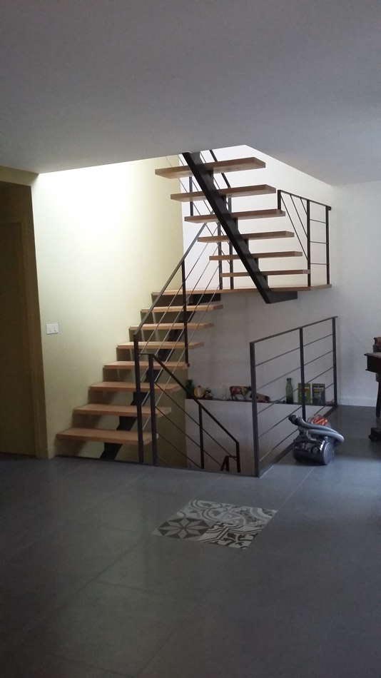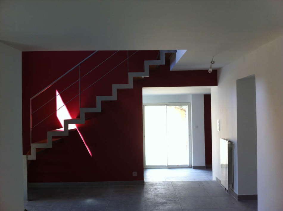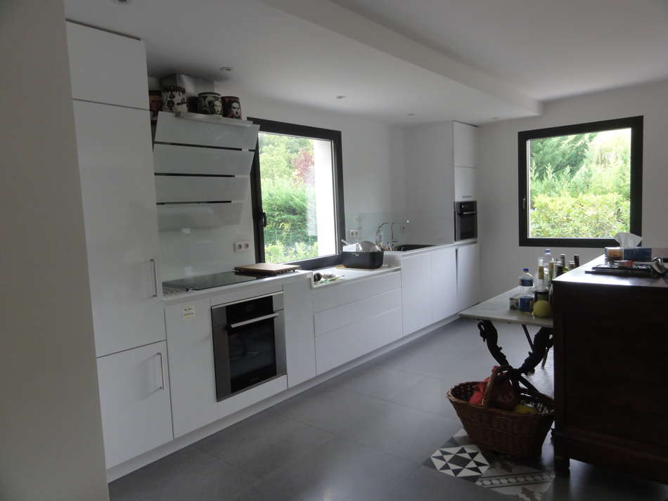 Surface rénovée 95 m2. Transformation du garage en cuisine (autre garage construit sur le terrain), restructuration du RDC, création d'une salle d'eau et d'un bureau à l'étage, agrandissement trémie de l'escalier.